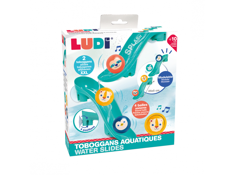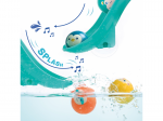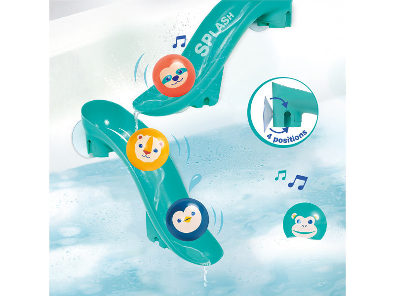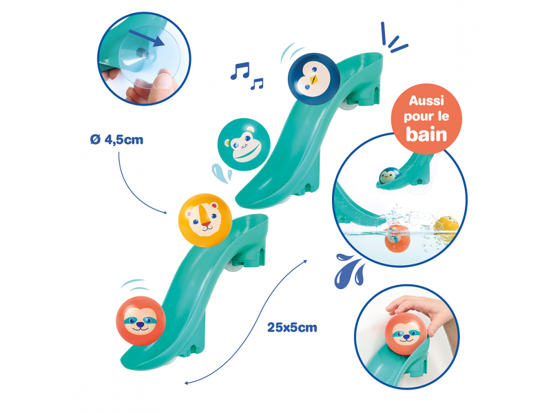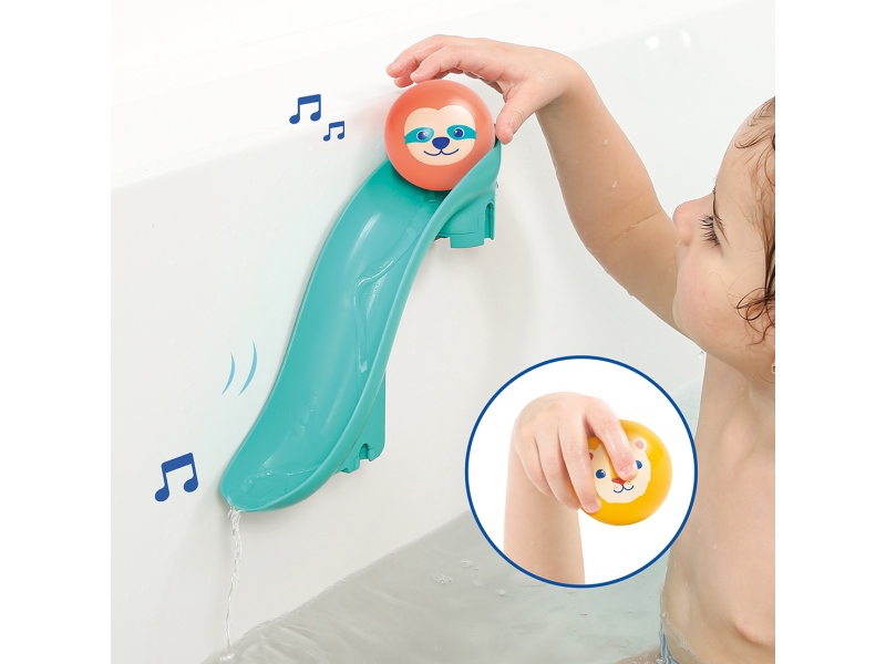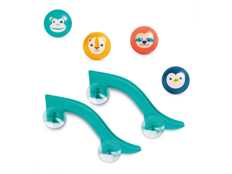 Tobogány s míčky do vany promění každé koupání v zábavnou vodní dráhu, kterou si dítě může samo sestavit a měnit. Díky silným přísavkám se jednotlivé díly snadno upevní na hladké povrchy (obklady, vanu) a drží stabilně i během hry. Dítě pozoruje, jak se míčky pohybují po dráze, zkouší různé varianty a postupně chápe princip příčina–následek. Čtyři plovoucí míčky s rolničkou při jízdě po skluzavce jemně cinkají a podněcují další objevování.