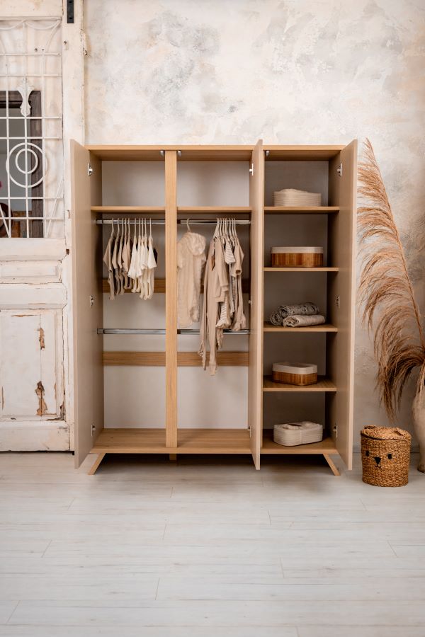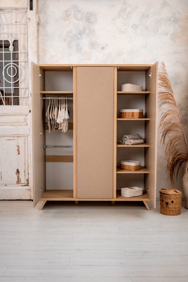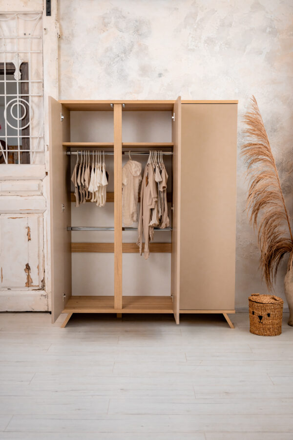 Je pravda, že větší šatní skříň zabírá více místa, ale nabízí také spoustu úložných možností. Dveře využívají moderní technologii otevírání push-open: místo úchytky se otevírají jediným stisknutím díky zabudovanému vysouvacímu mechanismu, který poskytuje čistý, stylový vzhled a pohodlné používání. Skříň lze navíc používat od novorozeneckého až po dospělý věk.