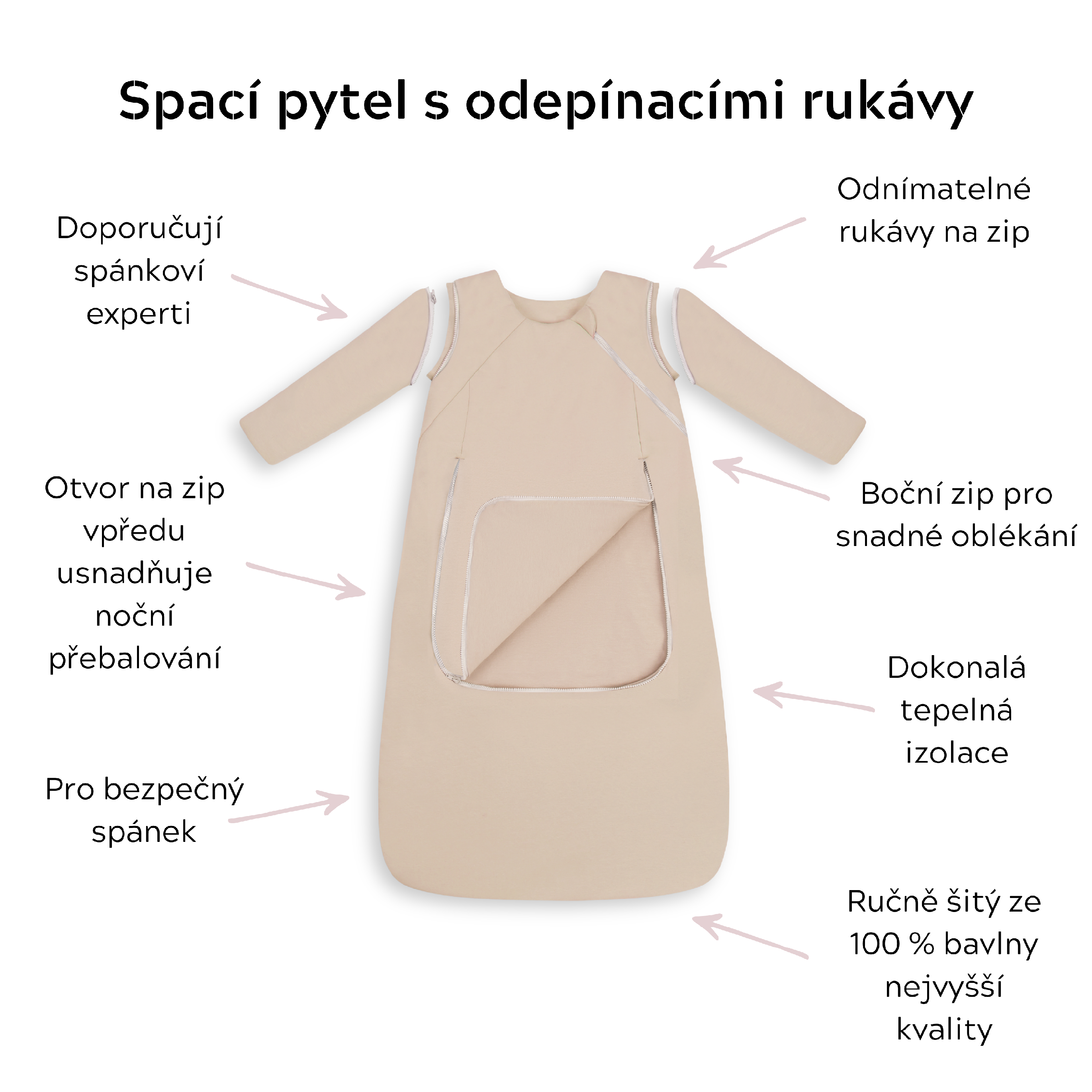 Víme, jak je spánek důležitý jak pro dítě, tak pro rodiče. Zajistit vám i vašemu děťátku dlouhý a bezpečný spánek je naším posláním. S obrovskou hrdostí a radostí vám proto představujeme produkt, na kterém jsme pracovali velmi dlouho tak, aby byl dokonale funkční a praktický. Jako odborníci na výrobu spacích pytlů jsme pro vás vytvořili celoroční spací pytel s odepínatelnými rukávy!