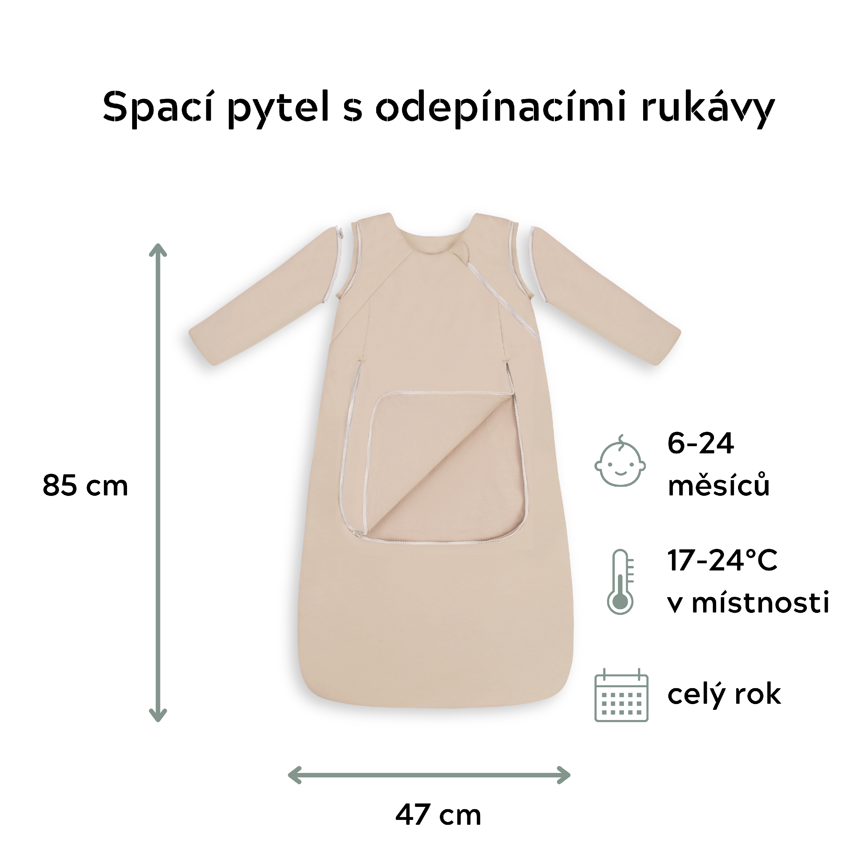 Spací pytel jsme navrhli tak, aby zajistil maximální pohodlí pro miminko a usnadnil život rodičům. Má odnímatelné rukávy, díky čemuž je všestranným pomocníkem do každého počasí. Když je zima, můžete nechat rukávy nasazené, aby bylo miminko celé zakryté. Během teplejších nocí rukávy jednoduše odepněte a spací pytel proměníte v pohodlnou verzi bez rukávů. Spací pytel se vždy přizpůsobí vašim aktuálním potřebám.