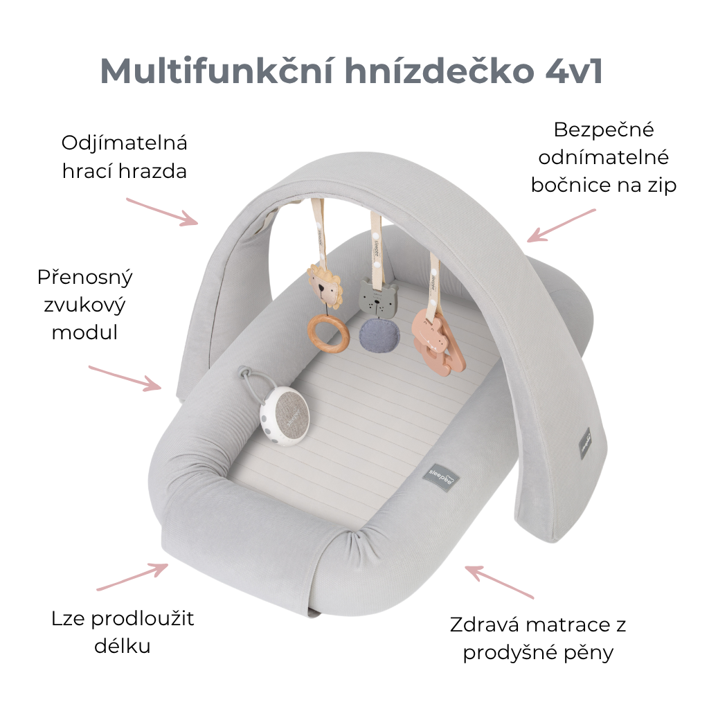 Multifunkční hnízdečko pro miminko Sleepee 4v1 obsahuje bezpečné hnízdečko s odnímatelnými boky, prodyšnou pěnovou matraci, hrací hrazdičku pro miminko se závěsnými hračkami, zvukový modul s bílým šumem, tlukotem srdce a zvuky deště a přírody. K sadě získáte luxusní prostornou tašku jako dárek zdarma pro snadný přenos hnízdečka.