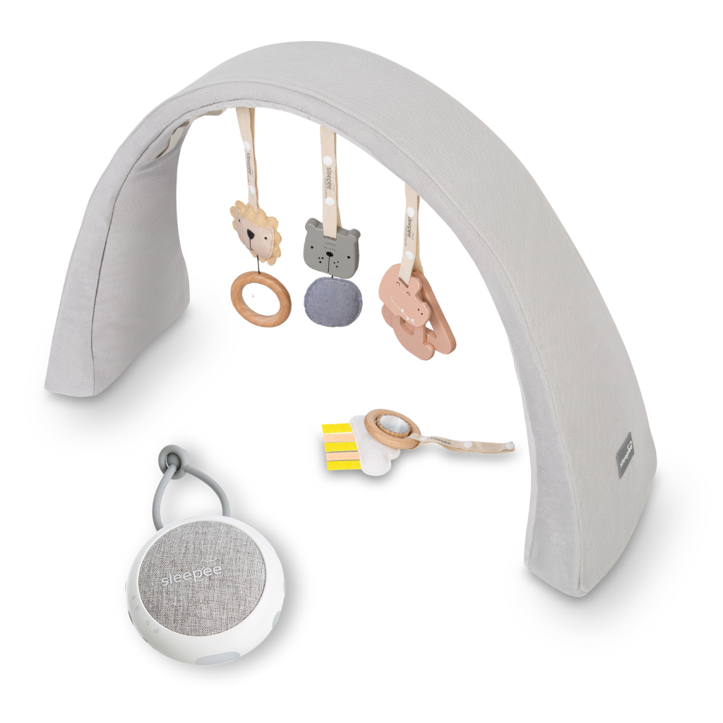 Nastavitelná hrazdička s hračkami a bílým šumem 2v1 Sleepee obsahuje hrací hrazdičku se závěsnými hračkami a zvukový modul s bílým šumem, tlukotem srdce a zvuky deště a přírody. K sadě získáte luxusní prostornou tašku jako dárek zdarma pro snadný přenos hnízdečka.