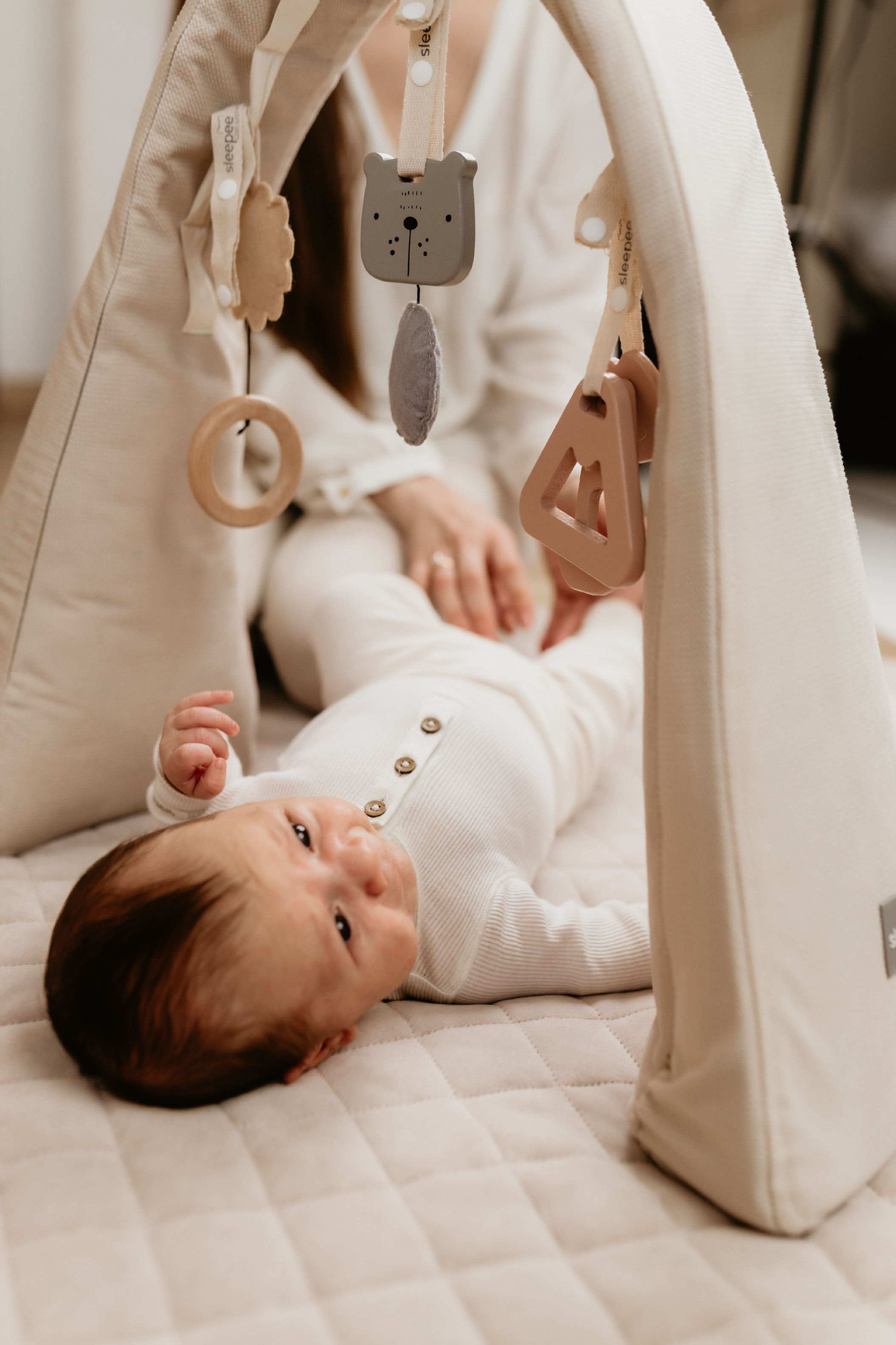 Hrazdička Sleepee je multifunkční a můžete ji využít nejen jako součást hnízdečka, ale také samostatně na hrací dece, posteli nebo gauči.
