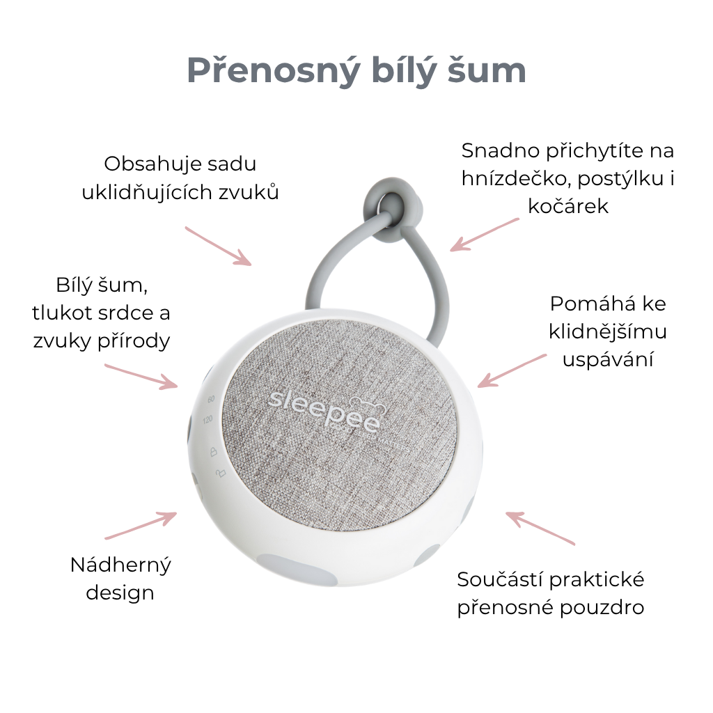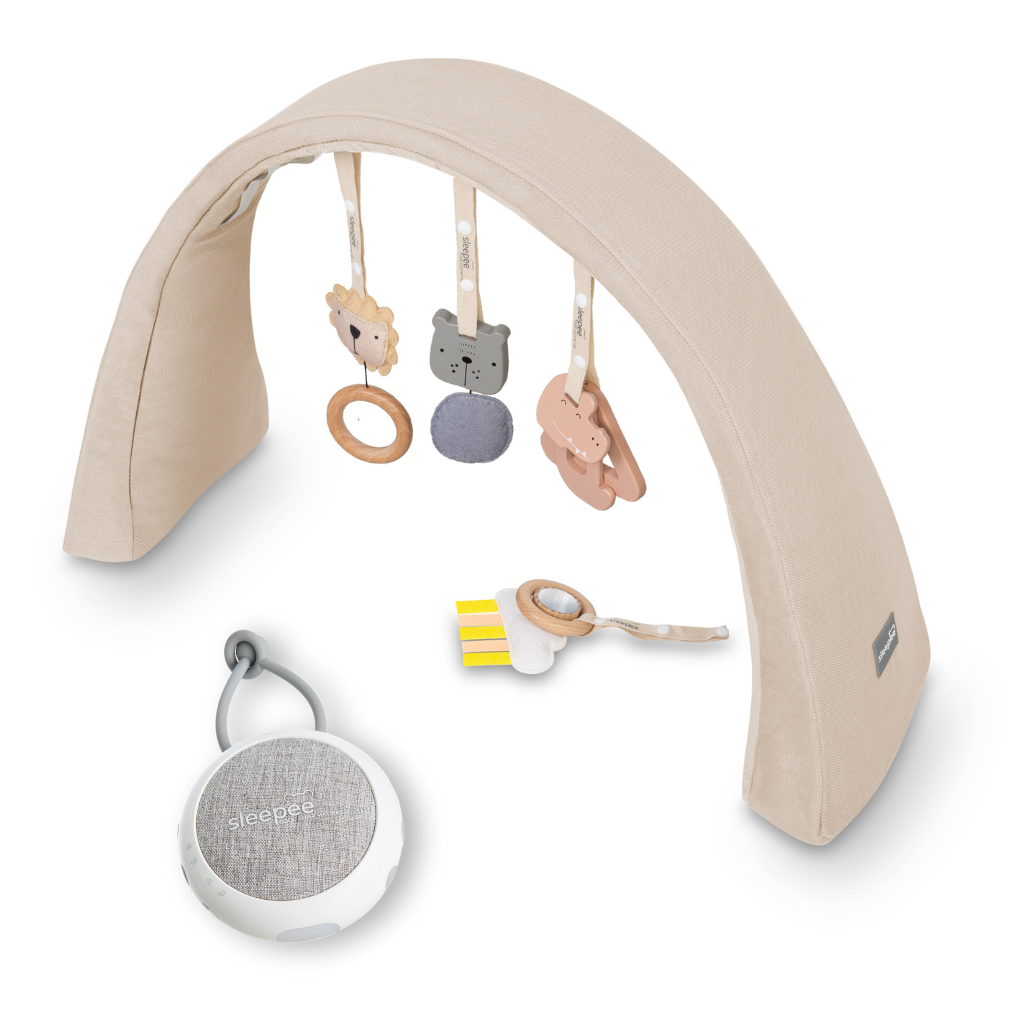 Nastavitelná hrazdička s hračkami a bílým šumem 2v1 Sleepee obsahuje hrací hrazdičku se závěsnými hračkami a zvukový modul s bílým šumem, tlukotem srdce a zvuky deště a přírody. K sadě získáte luxusní prostornou tašku jako dárek zdarma pro snadný přenos hnízdečka.