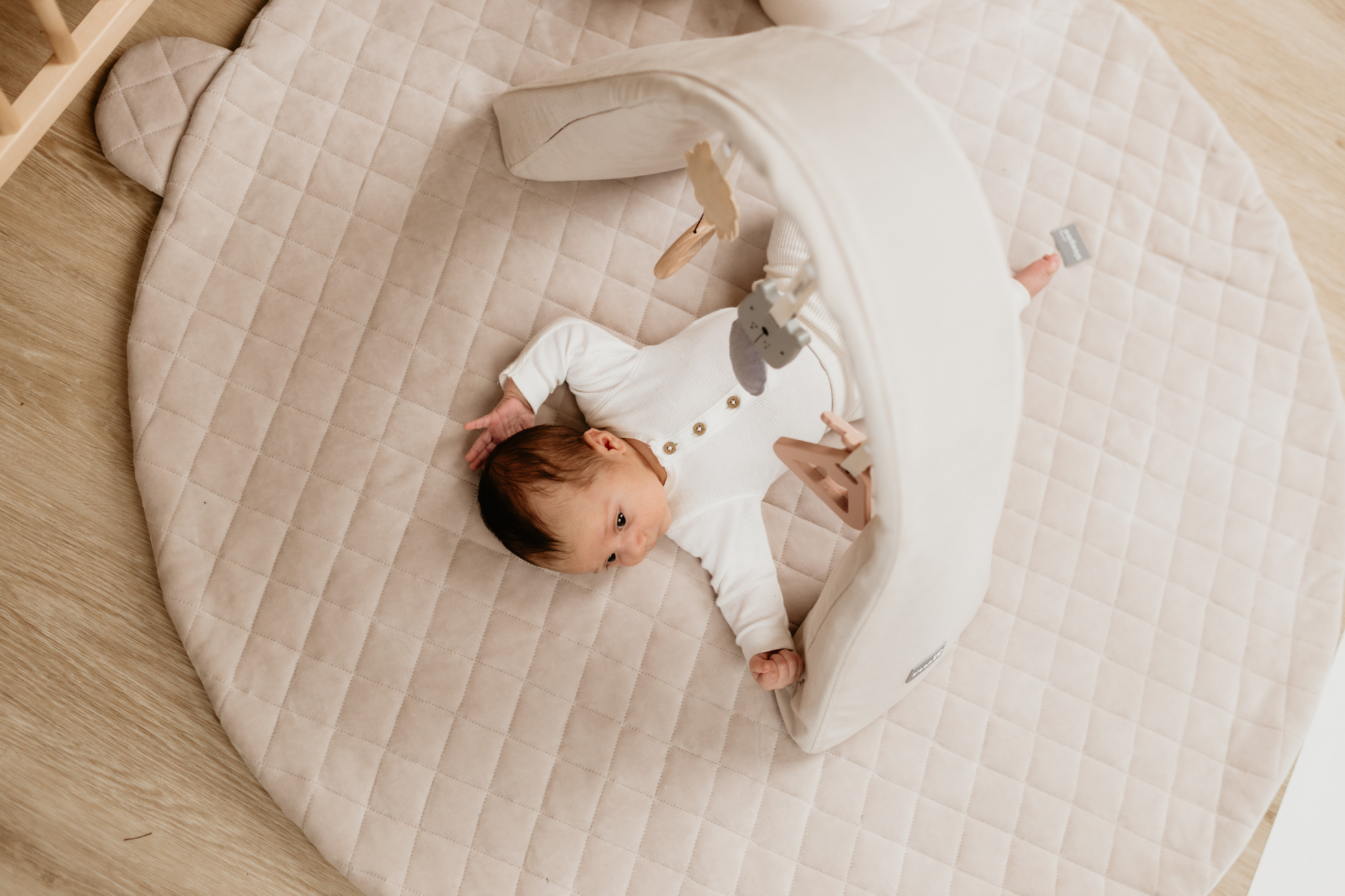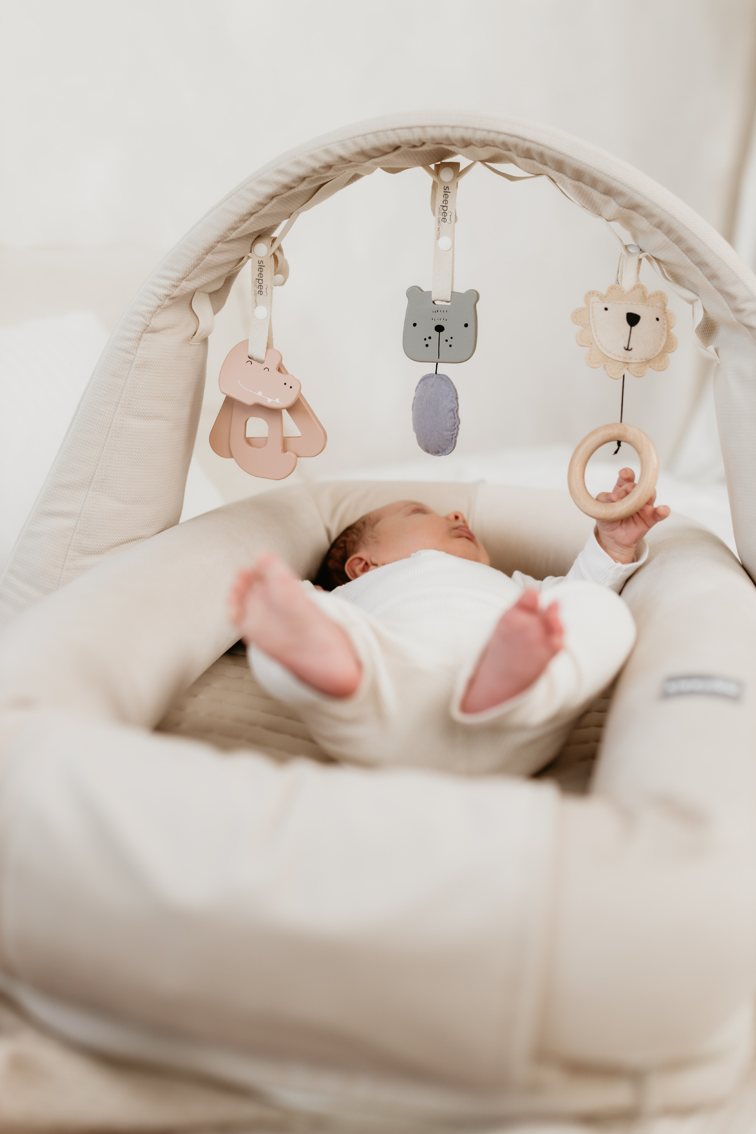Hrazdička Sleepee je multifunkční a můžete ji využít nejen jako součást hnízdečka, ale také samostatně na hrací dece, posteli nebo gauči.