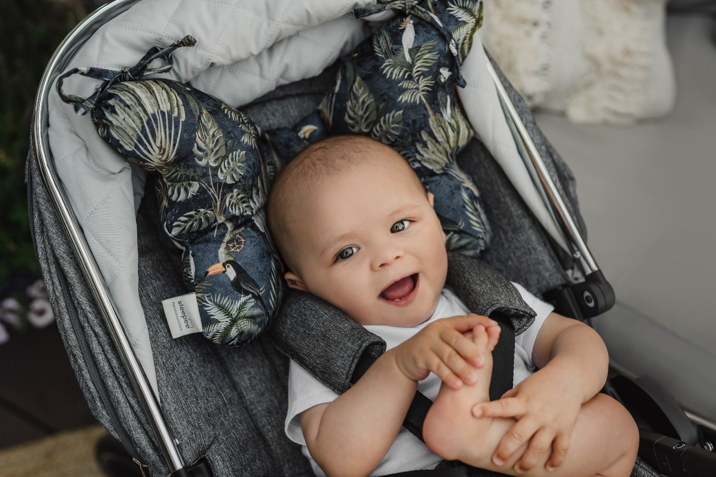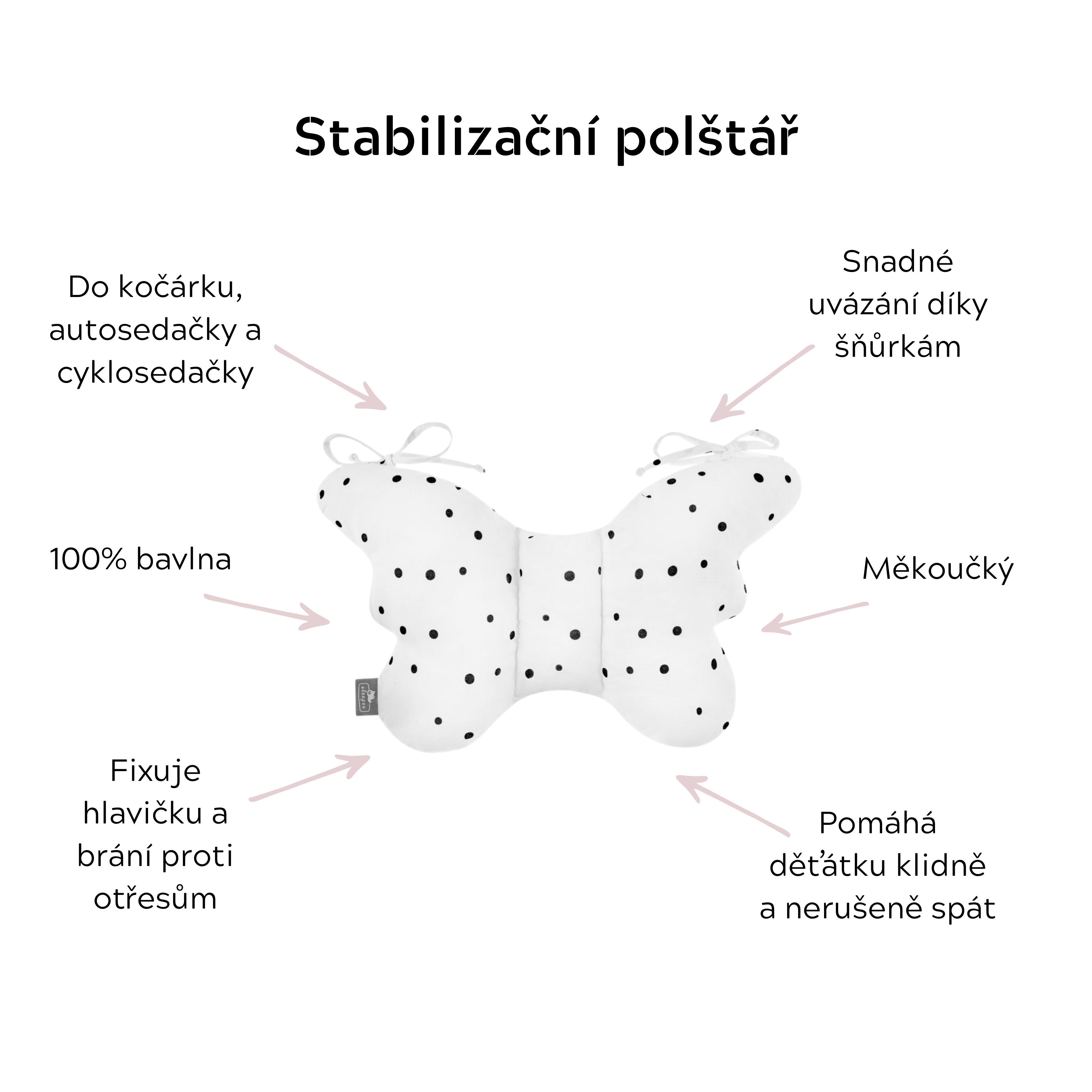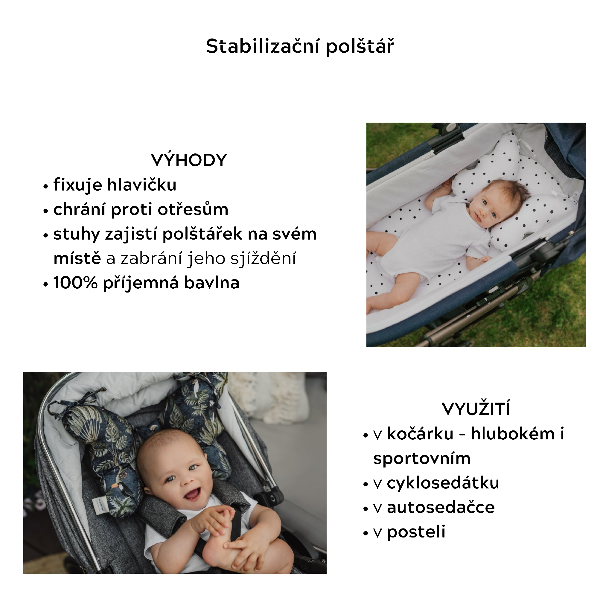 Polštářek doporučujeme při jízdě s kočárkem po nerovném povrchu, protože výrazně tlumí otřesy hlavičky a pomáhá děťátku klidně a nerušeně spát.