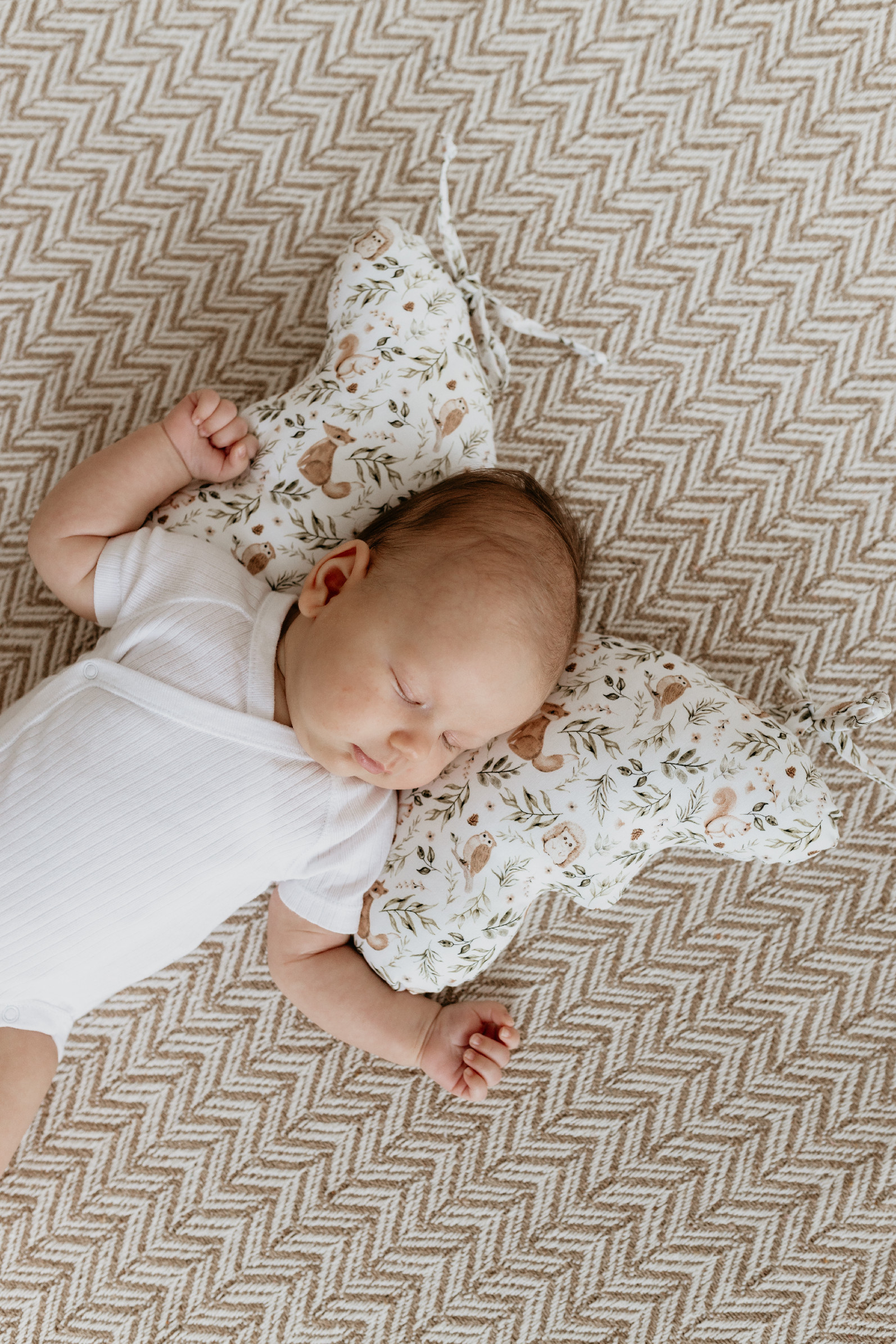 Praktický stabilizační polštářek Sleepee Butterfly pillow Ivory Forest využijete především na cestách. Podporuje křehkou hlavičku dítěte a chrání ji proti otřesům. Díky šňůrkám připevněným v horních rozích polštářku ho můžete snadno připevnit k autosedačce, cyklosedačce, kočárku či příčkám postýlky. Polštář bude držet na svém místě a hlavička dítěte tak bude chráněna.