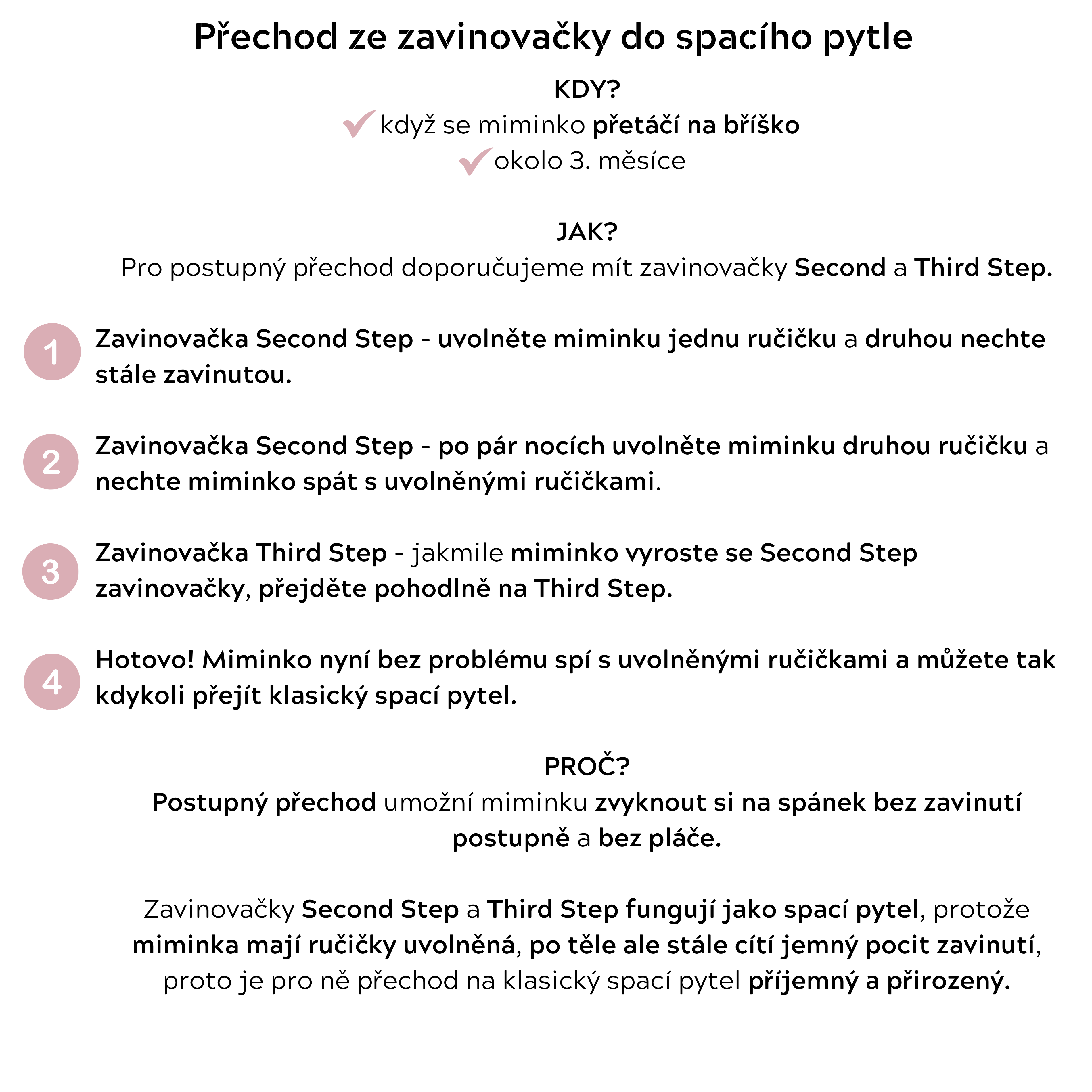 přestat používat zavinovačku Swaddle a vyměnit ji za spací pytel.