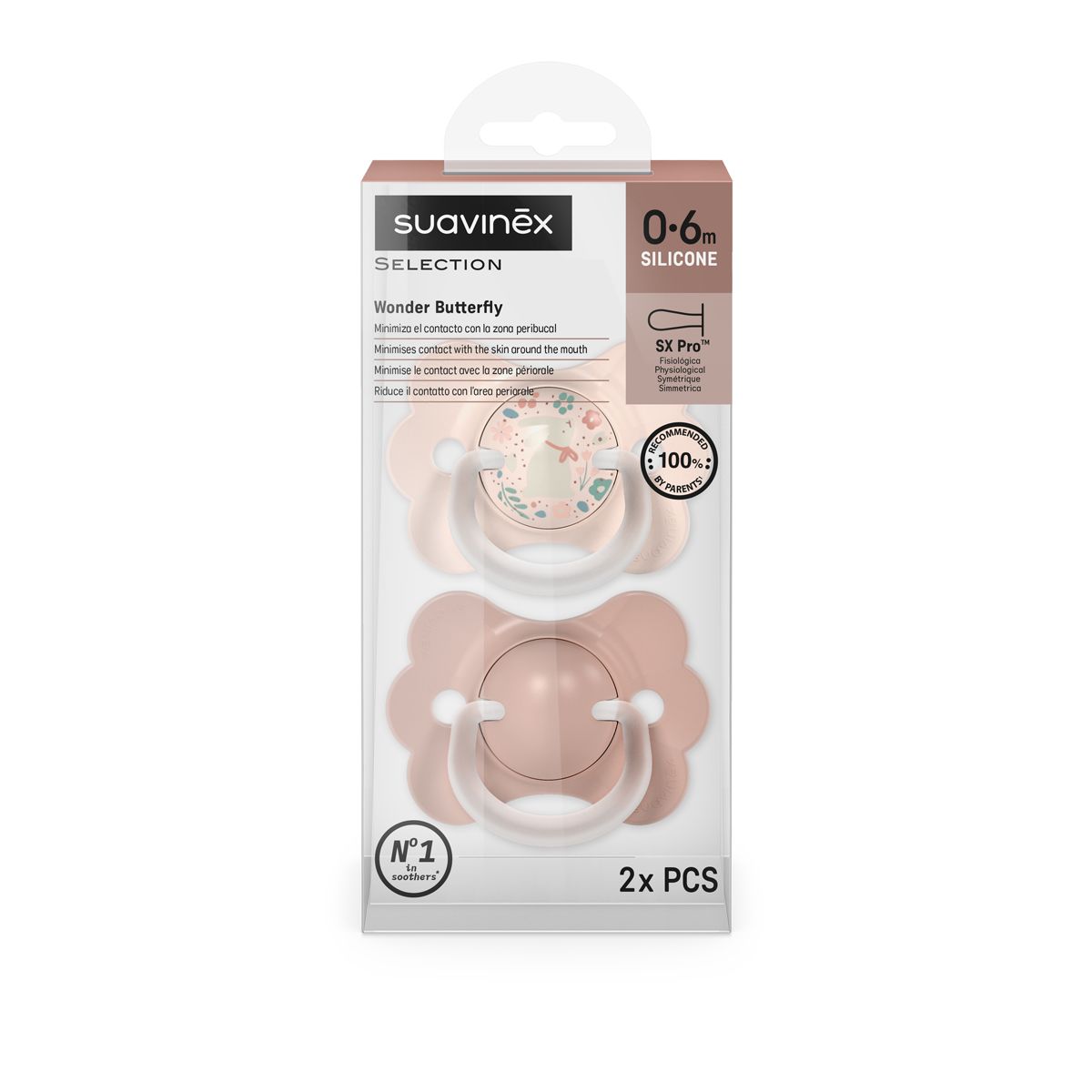 Dudlíky jsou vybaveny fyziologickou savičkou SX Pro ze silikonu, která je plochá a symetrická. Díky tomu přirozeně respektuje vývoj ústní dutiny dítěte a nenarušuje jeho přirozené sací reflexy.