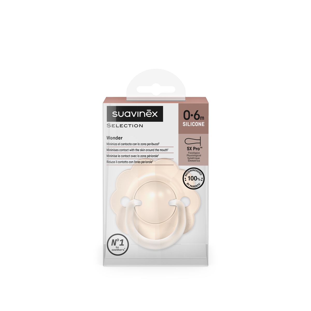 Dudlíky Wonderland jsou vybaveny fyziologickou savičkou SX Pro ze silikonu, která respektuje přirozený vývoj ústní dutiny dítěte. Díky plochému a symetrickému tvaru se vždy správně přizpůsobí v ústech.