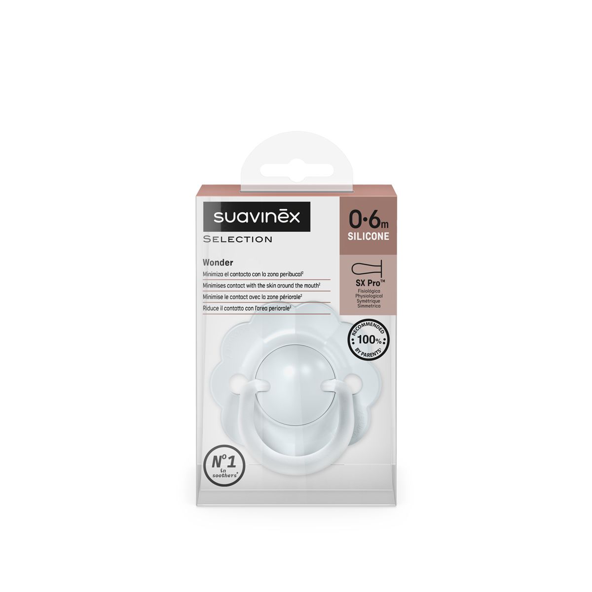 Dudlíky Wonderland jsou vybaveny fyziologickou savičkou SX Pro ze silikonu, která respektuje přirozený vývoj ústní dutiny dítěte. Díky plochému a symetrickému tvaru se vždy správně přizpůsobí v ústech.