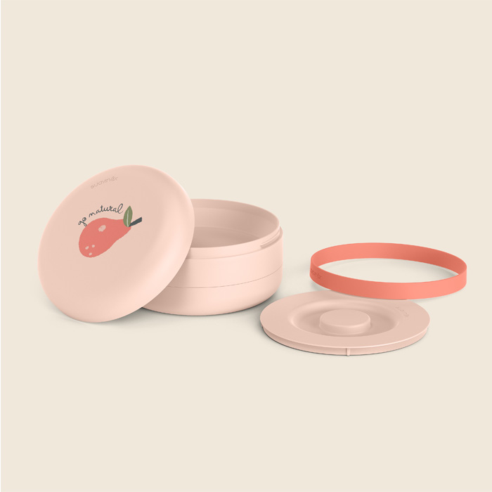 Poskytuje prostor pro dvě jídla. Spodní hlubší přihrádka na pyré nebo jinou mixovanou dětskou výživu s kapacitou 285 ml. Ochranný vniřní kryt. Šroubovací víčko, které lze otevřít a uzavřít jednou otáčkou. Střední přihrádka je určená pro pevné potraviny s kapacitou 210 ml.