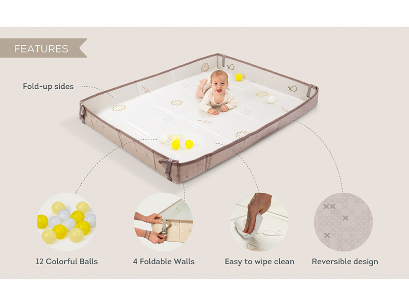 Extra velká, oboustranná pěnová hrací deka vyniká svou univerzálností a pohodlím pro vás i vaše dítě od narození. Jedinečné zvednuté okraje vytvářejí bezpečnou, uzavřenou hrací plochu, udržují hračky a míčky na dece a poskytují miminku pocit bezpečí. Starším dětem okraje snadno položíte, abyste maximalizovali plochu na hraní.