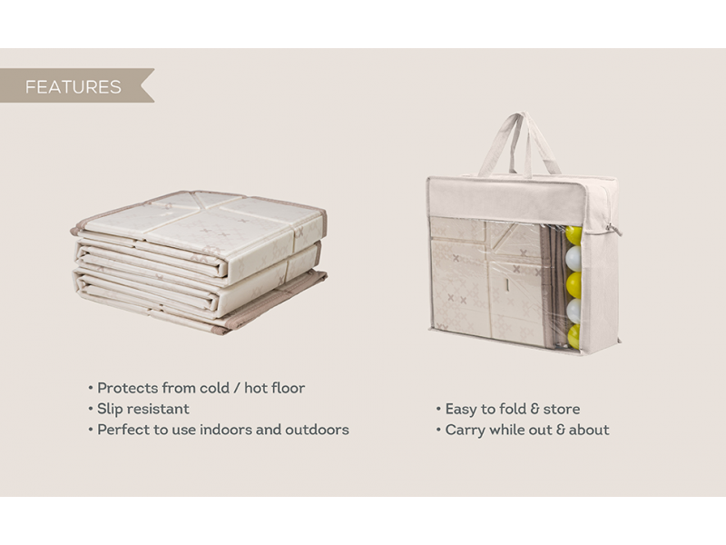 Materiál, ze kterého je hrací podložka vyrobena, je zcela bezpečný pro zdraví vašeho dítěte a neobsahuje BPA, PVC, olovo, ftaláty ani rtuť.