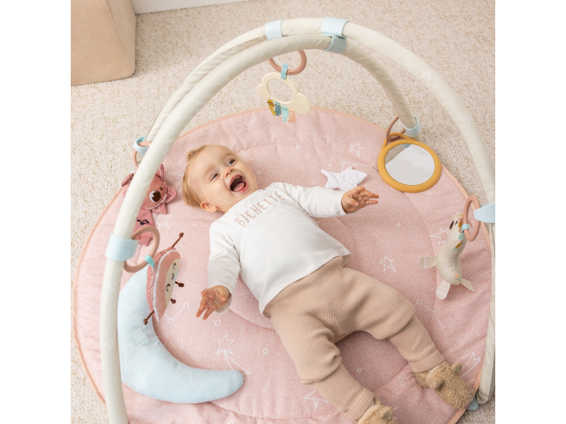 Posuvný středový díl umožňuje přizpůsobit hrazdu věku dítěte, hraní na bříšku apod. Hudební box v podobě komety hraje melodie a dítě si je aktivuje samo dotykem. Bezpečné zrcátko i polštářek ve tvaru půlměsíce podněcují dítě ke hraní na bříšku. Závěsné hračky včetně chrasticího jednorožce a množství dalších aktivit přímo na dece stimulují různé smysly dítěte. Jednotlivé hračky je možné používat i samostatně mimo deku.