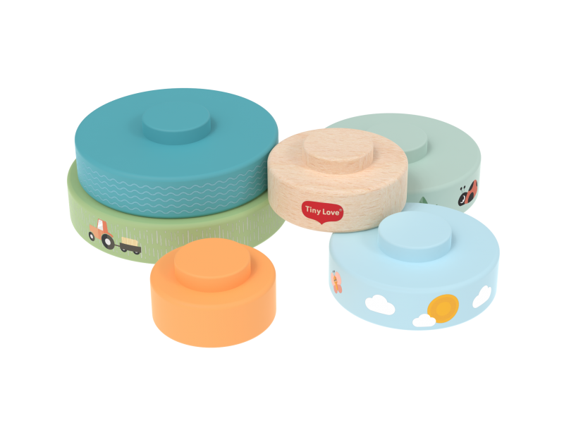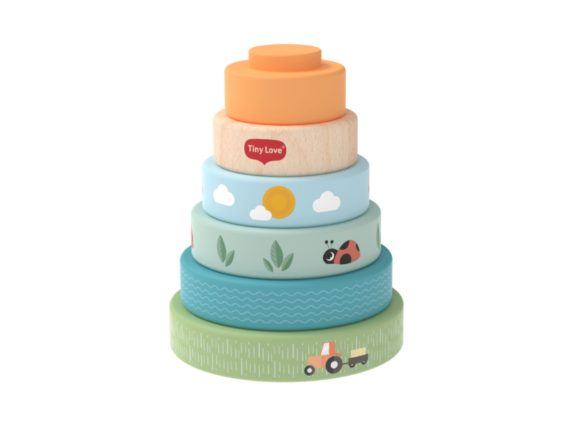 Dřevěné nasazovací kroužky Tiny Love nabízí různé možnosti hraní – děti je mohou nasazovat a stavět do věže, třídit podle velikosti, kutálet s nimi a postupně objevovat a rozlišovat barvy, velikosti a jednoduché souvislosti. Kroužky s krásným potiskem motivů ze života na farmě jsou lehké a dobře se drží i malými dětskými ručičkami. Hračka přirozeně rozvíjí jemnou motoriku, koordinaci ruka–oko i první logické myšlení.