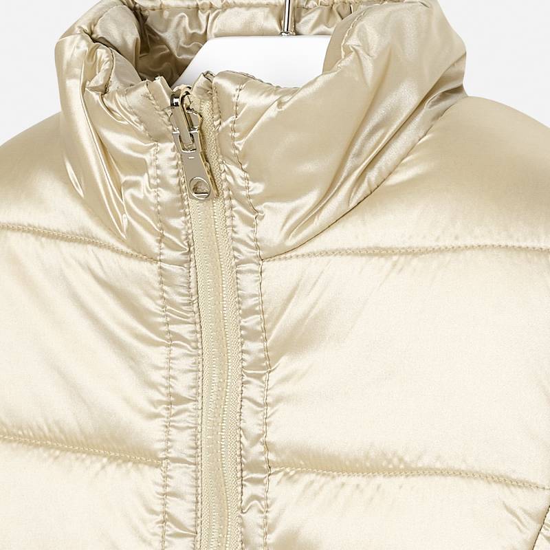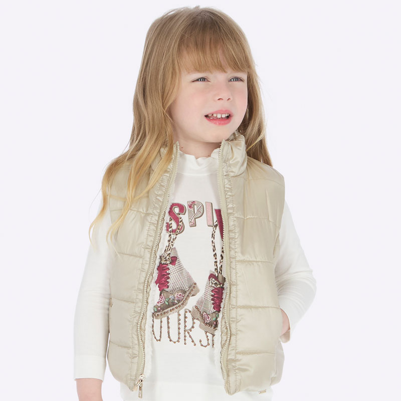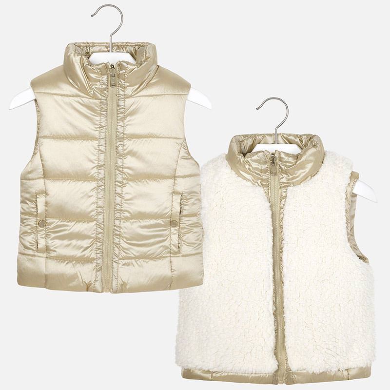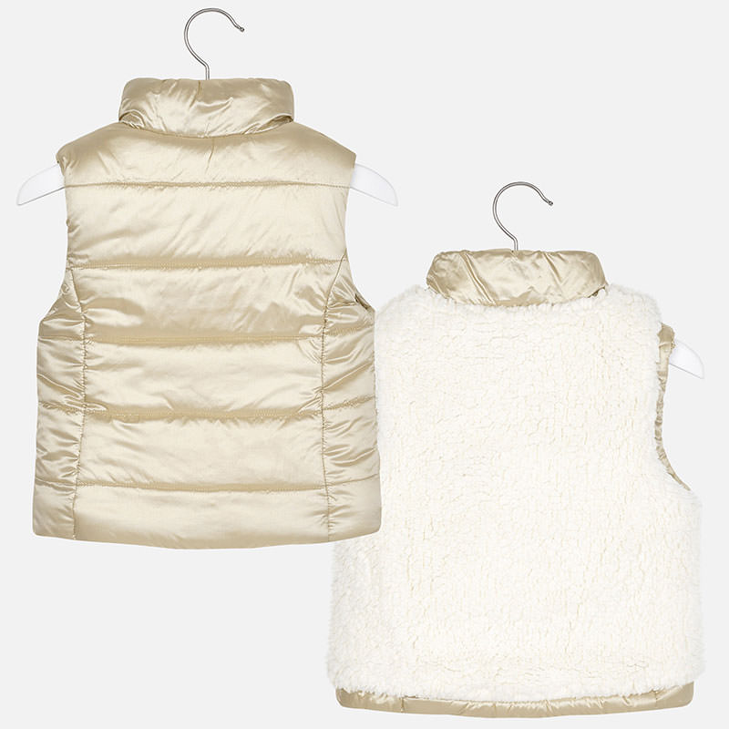 Krásná oboustranná vestička pro holčičku od španělské značky MAYORAL. Velmi pěkná barva champagne a z druhé strany moderní kožíšková vestička.