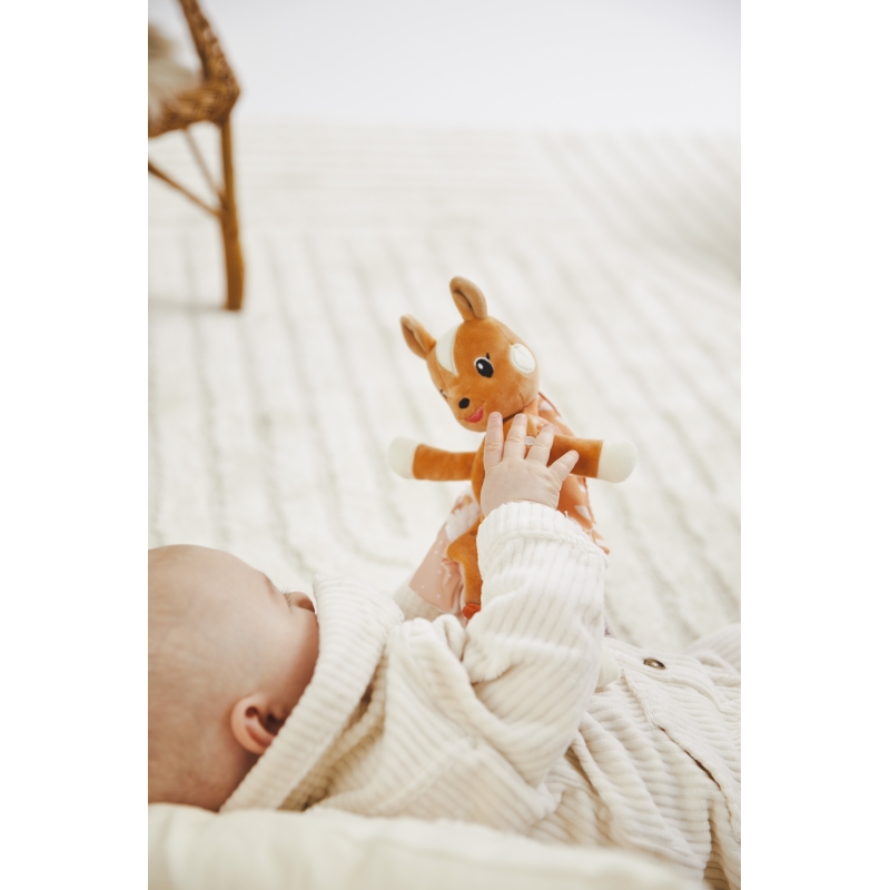 Hračka vydává pískací zvuky, které dítě zabaví a rozvíjí jeho sluch, zatímco pomáhá navázat vztah příčiny k následku. Pružný materiál s několika částmi určenými ke žvýkání (uši, nohy atd.) dokonale poslouží ke zklidnění bolavých dásní dítěte při prořezávání prvních zoubků.